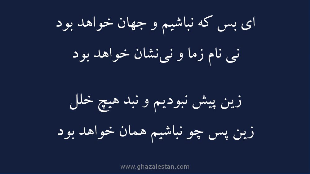 اگر قرار باشه یه شعری را انتخاب کنم و اون باشم قطعا همین دو بیتی است. فلسفی ترین شعری که میتونم نام ببرم. این دو بیتی دردناکترین و تلخ ترین حقیقتی است که با اون مواجه هستم