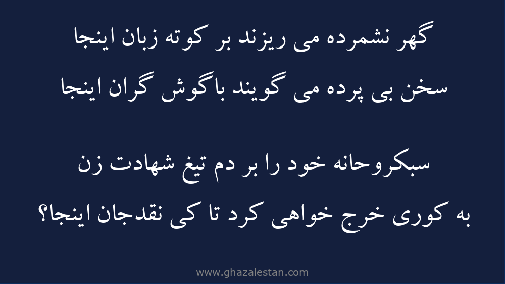 گهر نشمرده مى ريزند بر کوته زبان اينجا