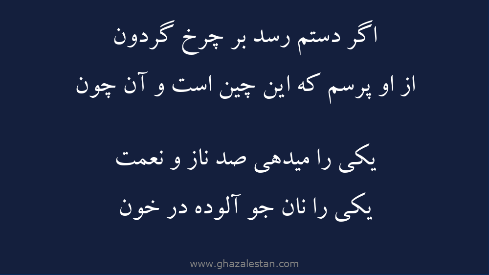 در این درگه که گه گه که که که که شود ناگه مشو غره به امروزت که از فدا نهی اگه. ............. اگر یه سر به بیمارستان سرطانیها و یتیمخونه ها و کارتون خوابها بزنیم بعضی هاشون تا ناز و نعمت بودن به دلایل بسیاری به این روز افتادن در طول عمرم دیدم افرادی که واقعا تلاش کردن تلاششون به ثمر رسیده و موفق بودن حالا هی من بشینم از خدا ایراد بگیرم اول خودم رو بسنجم چقدر تلاش کردم بعد ایراد بگیرم چه بسا ندادهاش بهتر از داده هاش هست که خدایی نخواسته تو نکبت نیفتیم این به سر من اومده