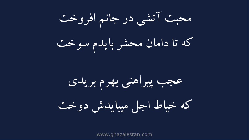 اصل شعر چیز دیگر است محبت آتشی بر جانم افروخت که تا صبح قیامت بایدم سوخت زآبش گر برون آری بمیرد محبت را زماهی باید آموخت